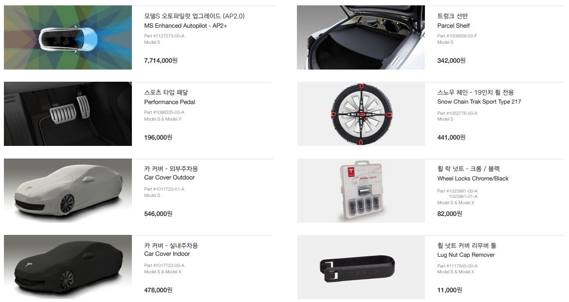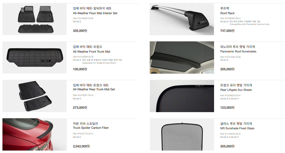 한국 테슬라 모델S 기준 업그레이드 및 액세서리 카탈로그입니다.