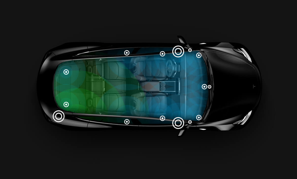 | -. 테슬라의 진화된 감지 범위 (8개의 카메라, 12개의 초음파 센서, 1개의 레이더) |