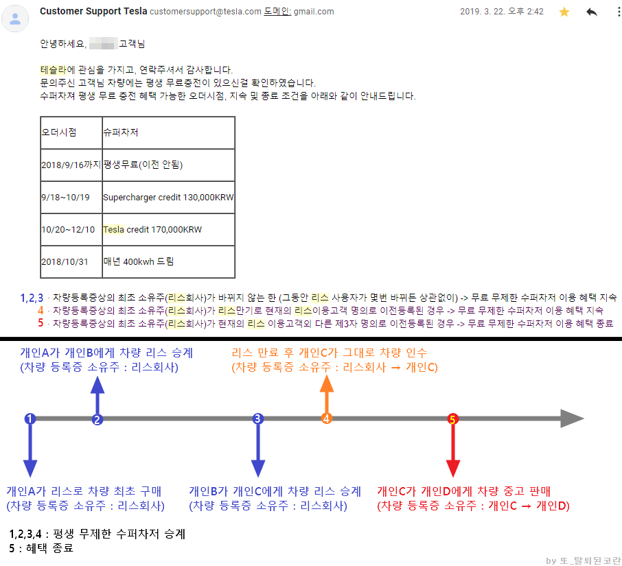 위 사진은 테슬라에서 문서(메일)로 답변을 준 리스 승계에 따른 평생 무제한 수퍼차저 혜택 이양 관련 안내입니다.