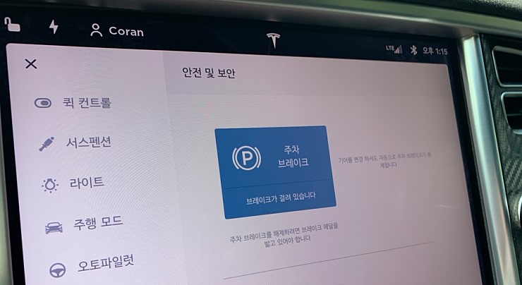 테슬라 화면에서 '안전 및 보안' 쪽으로 가시고, 주차 브레이크 버튼을 눌러줍니다.