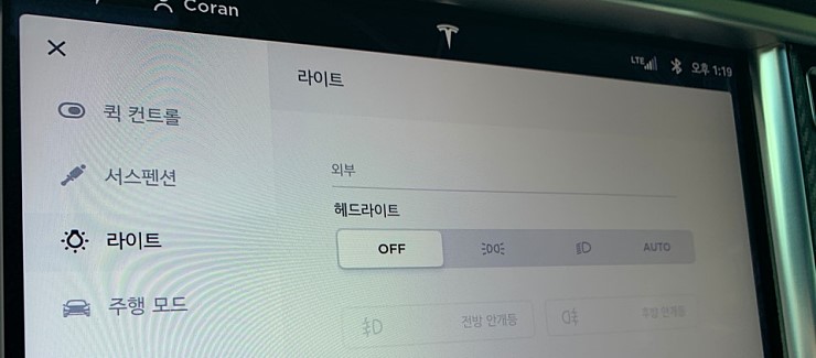 테슬라 화면에서 '라이트' 쪽으로 가시고 헤드라이트를 OFF 해주시면 됩니다.