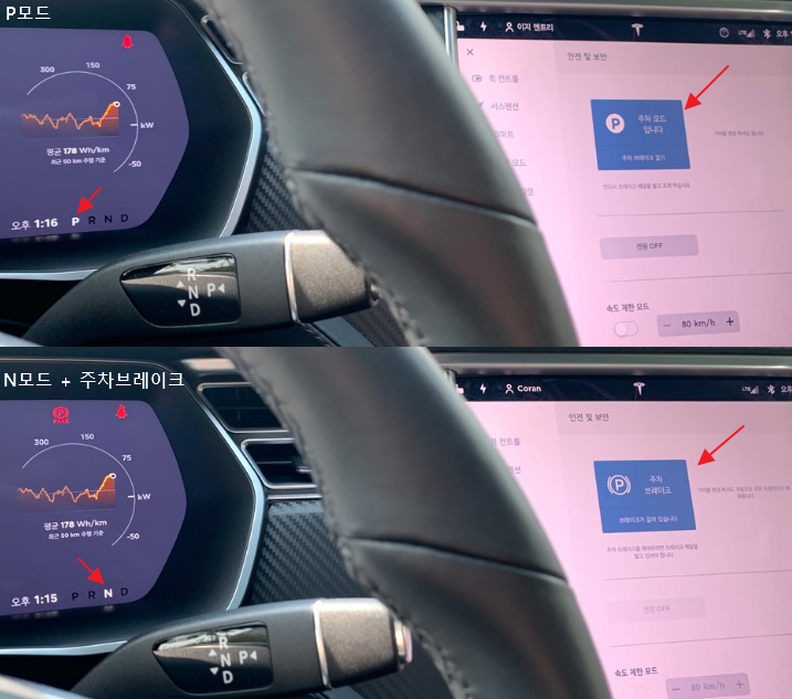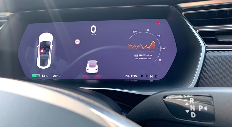 계기판에 N(중립)이 걸려있고, 테슬라 화면에는 P(주차 브레이크)가 걸려있다고 뜨지요.