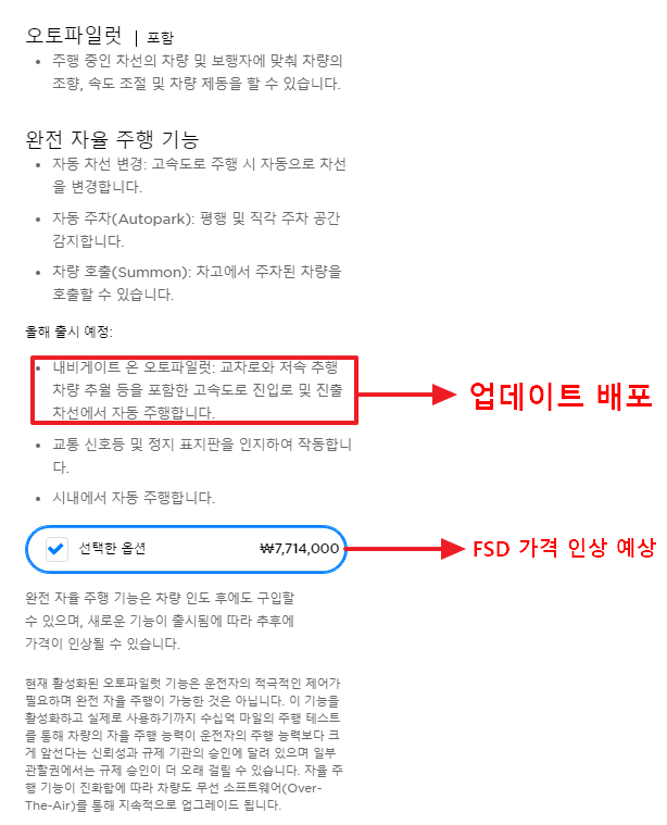 이번 업데이트로 그동안 한국은 가격이 동결되어있던 FSD 옵션 가격(7,714,000원)이 상승할 가능성이 높습니다.