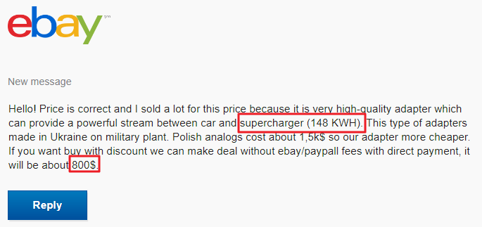 판매자는 우크라이나의 군용 공장에서 생산되는 제품이며 최대 148kWh의 충전속도를 지원한다고 합니다.