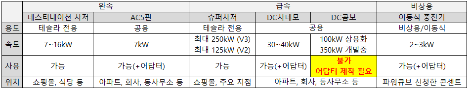 대한민국의 표준 급속 충전 규격으로 선택된 DC콤보는 테슬라가 이용할 수 없었습니다.