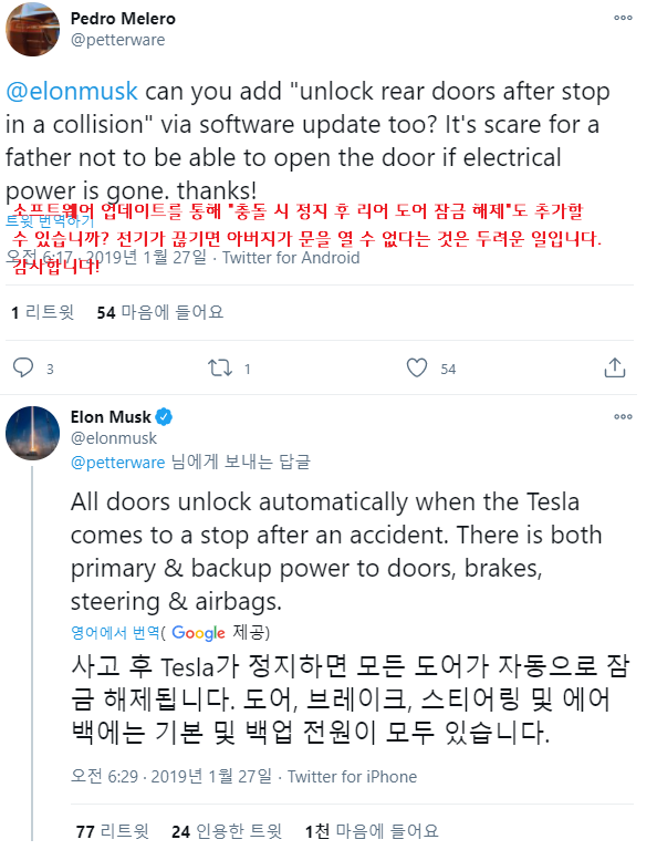 대부분의 내용은 테슬라의 전기적으로 여는 문이 전기가 끊기면 열리지 않는다라는 내용이 주된 논점입니다.