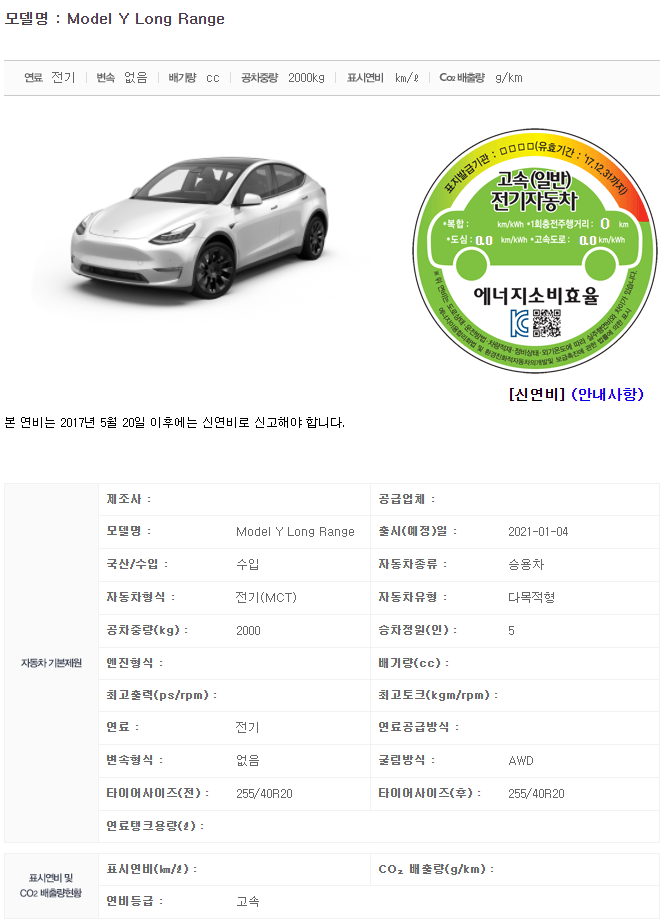한국 에너지 공단에 업데이트된 정보에 따르면 테슬라 모델Y 롱레인지의 한국 1회충전주행거리는 511km로