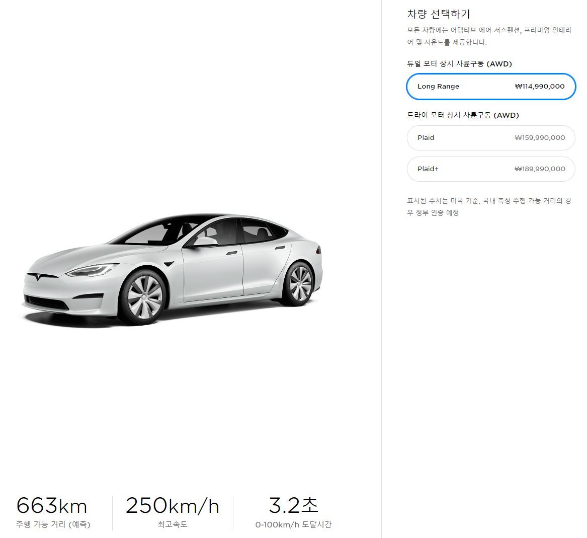 신기한 것은 모델S Plaid와 모델X Plaid의 가격이 159,990,000원으로 동일합니다.