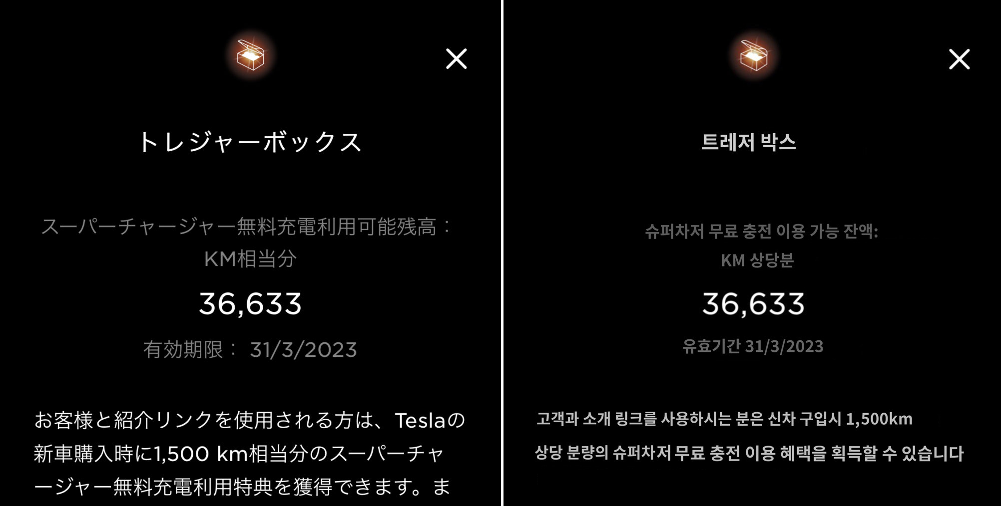 2021년 6월 4일부터 Tesla 오너와 오너의 추천 링크를 사용하여 신차를 구매하시는 분들께 1,500 km의 무료 수퍼차징 마일리지를 드립니다. 6월 4일 이전에 획득하신 Tesla 크레딧은 기존과 같이 신차, 차량 서비스 및 액세서리 구매에 사용하실 수 있습니다.