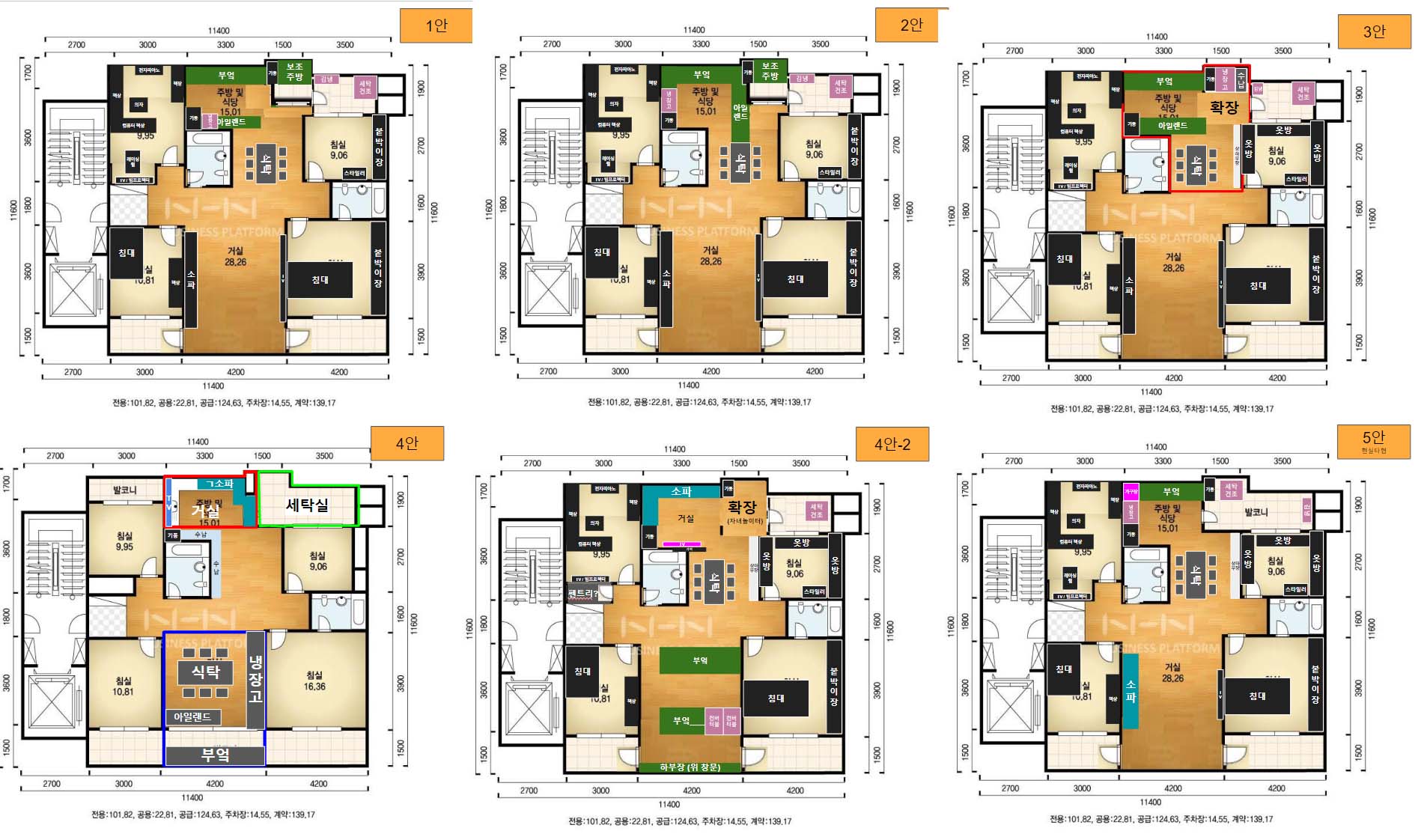 실제로 처음 미팅 할 때 보여주신 시안 중 앞에 2개는 '무난한 레이아웃' 과 '거실/주방 치환' 레이아웃이었습니다.