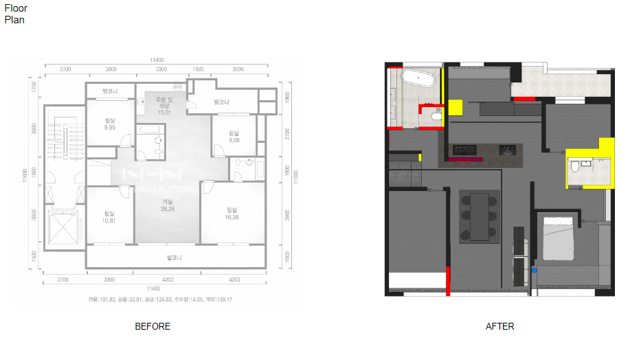 거실에 튀어나온 화장실을 없애고 그 자리를 주방으로 확장하는 아이디어였습니다.