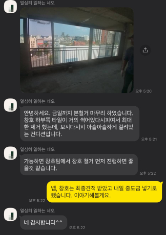 인테리어 업체와 단톡방을 파고 거기서 상황을 사진으로 계속 공유받았습니다.
