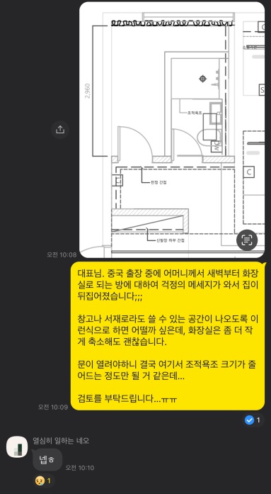 예~전 어머니께서 인테리어 공사를 맡기셨을때는 그냥 전화나 문자로 연락을 주고 받았던 것 같은데